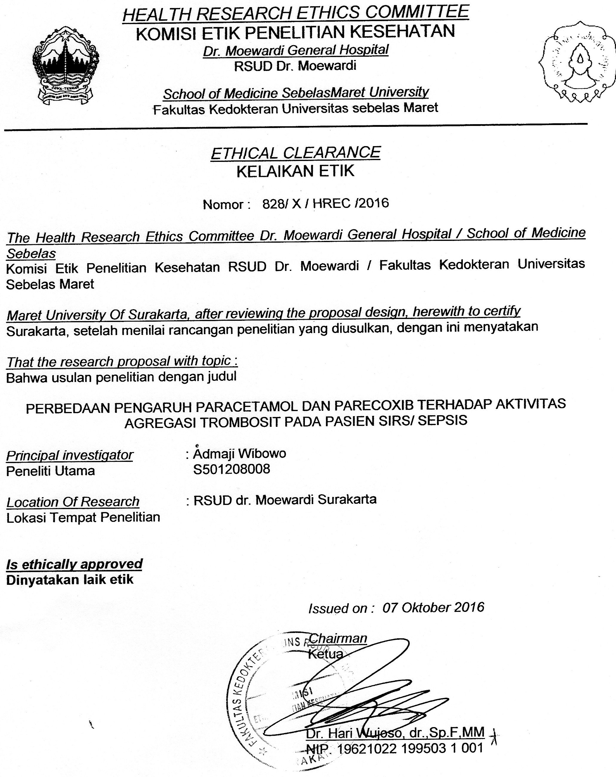 Metode: Penelitian ini merupakan penelitian experimental dengan pendekatan uji klinis dengan rancangan penelitian pre dan post. Terdapat 34 subjek penelitian pasien SIRS atau sepsis yang dirawat di ICU dengan umur antara 17 - 65 tahun. Distribusi sampel meliputi 17 subjek dengan pemberian parasetamol dan 17 subjek dengan pemberian parecoxib. Setelah dilakukan pengacakan dilakukan pemeriksaan agregasi trombosit sebelum perlakuan dan 120 menit sesudah perlakuan dengan menggunakan induktor 10 µM ADP.
