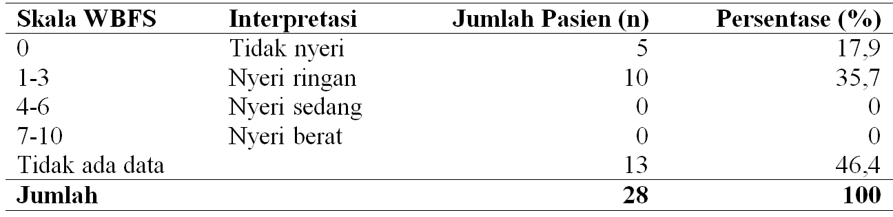 Metode: Penelitian ini merupakan retrospektif deskriptif dengan mengamati profil pemberian obat analgesik berdasarkan golongan obat analgesik terbanyak, analgesik tunggal dan kombinasi, analgesik awal dan lanjutan, berdasarkan kelompok umur anak dan dewasa dan cara pemberian. Penelitian juga akan meliputi sosiodemografi (jenis kelamin dan umur) pasien dan tingkatan nyeri setelah pemberian analgesik.