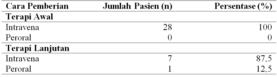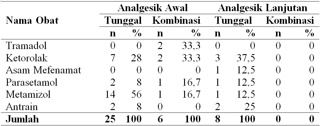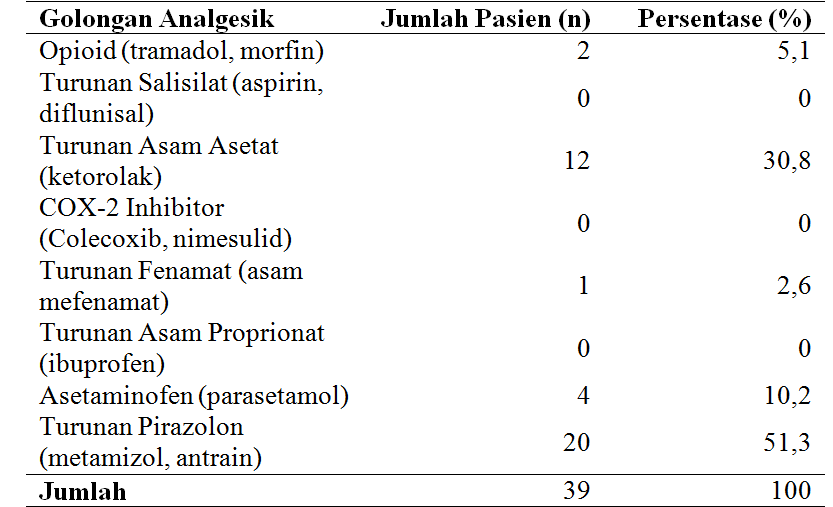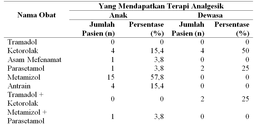 Hasil: Dari 28 sampel, kelompok analgesik yang paling banyak digunakan adalah pyazolon (metamizol, antrain) (51,3%), sedangkan pada terapi kombinasi didominasi tramadol dengan ketorolak (33,3%). Sebanyak delapan pasien (28,6%) dari total 28 pasien menerima analgesik lanjutan dari jenis lain. Metamizol adalah obat yang paling banyak digunakan untuk pasien anak-anak (57,7%), sedangkan pada pasien dewasa didominasi ketorolak (50%).