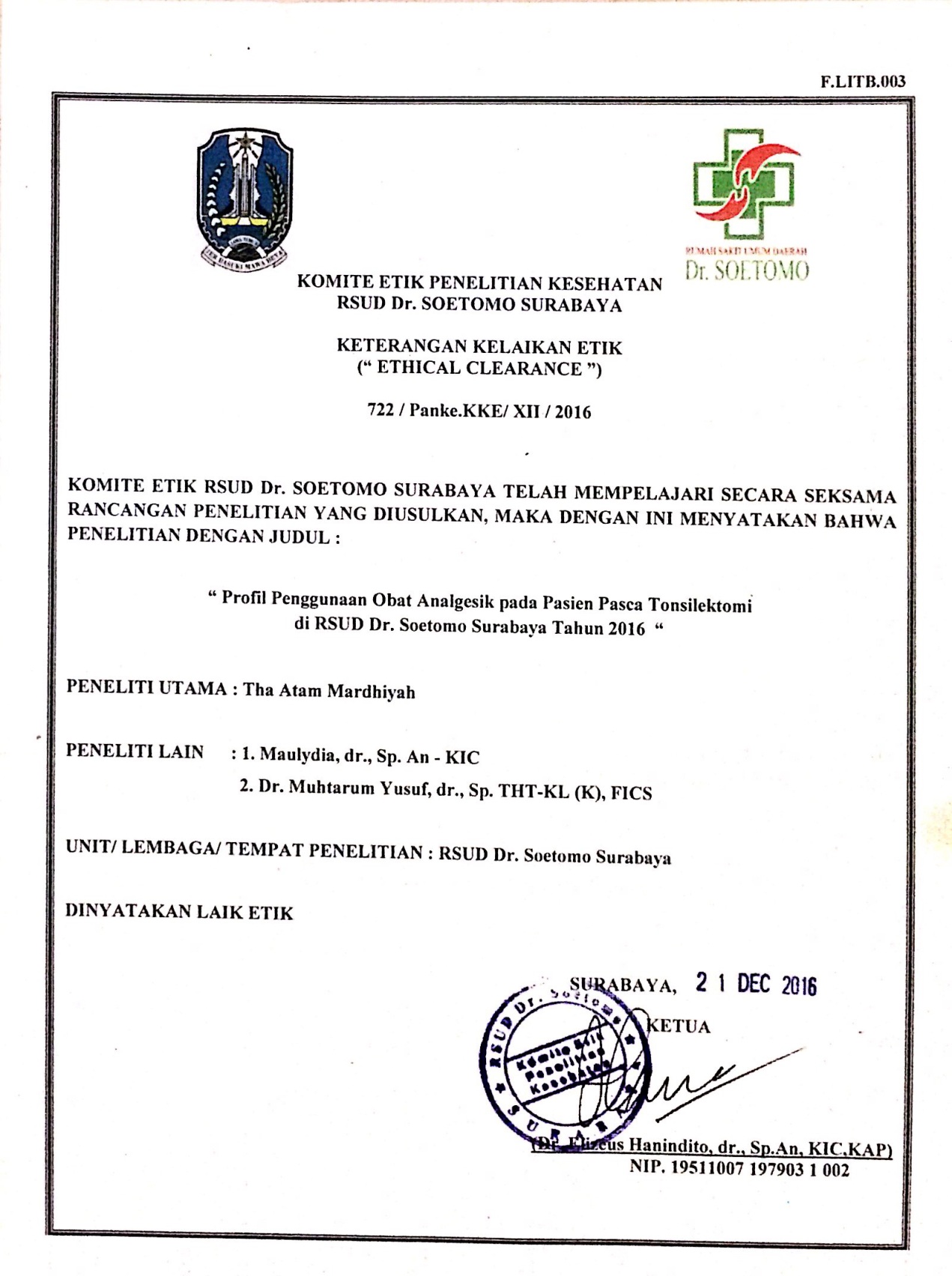 Latar Belakang: Nyeri merupakan keluhan yang umum terjadi pada hari pertama pascatonsilektomi dan merupakan hambatan yang signifikan dalam proses rehabilitasi. Pemberian analgesik yang dimulai sejak hari pertama pascatonsilektomi dapat meringankan nyeri. Peneliti melakukan pengamatan terhadap profil penggunaan obat analgesik pada pasien pascatonsilektomi di RSUD Dr. Soetomo Surabaya.