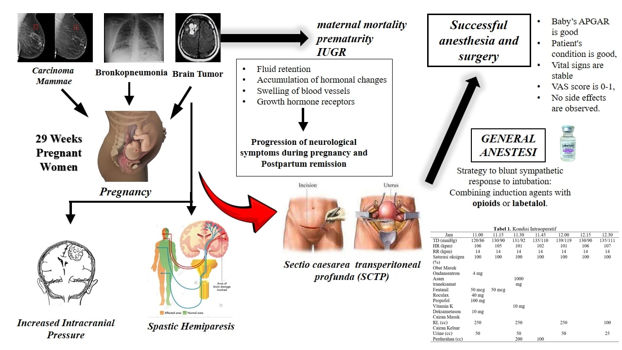 Case: We report a case of anesthesia technique using general anesthesia (GA) to accommodate sectio cesarean transperitoneal profunda (SCTP) in a 29 weeks pregnancy age, G1P0A0 female patient, ASA IIIE with intracranial SOL suspect cerebri abscess multiple dd/ tuberculoma, invasive mammae carcinoma, and bronchopneumoniae.