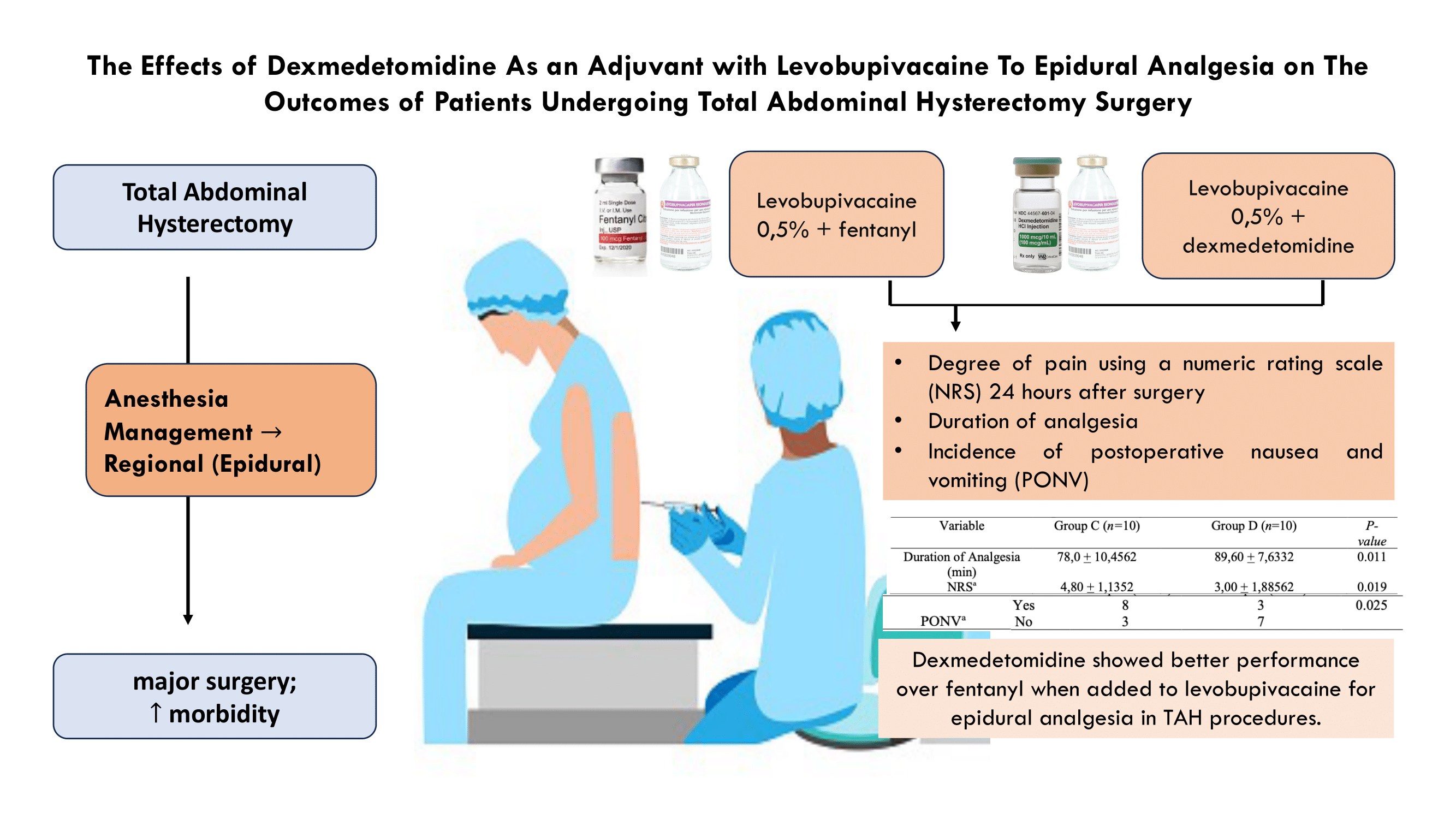 Conclusion: Dexmedetomidine is preferred over fentanyl when added to levobupivacaine for epidural analgesia in TAH procedures. Dexmedetomidine offers superior quality with a prolonged duration of analgesia, lower NRS values, and a lower incidence of PONV rather than fentanyl.