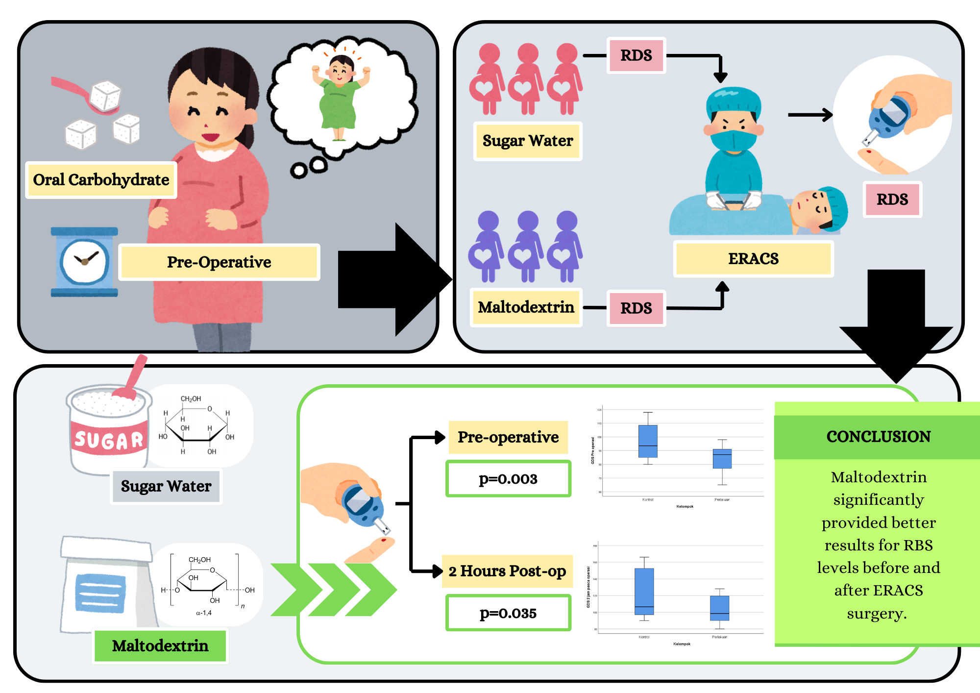 Methods: A randomized control study with pre-test and post-test design was used on 48 patients who underwent ERACS surgery at Dr. Kariadi hospital Semarang Indonesia and met the inclusion and exclusion criteria. Study subjects were divided into two groups: a pre-operative maltodextrin treatment group (n=24) and a pre-operative sugar water control group (n=24). RBG levels were checked with point-of-care testing (POCT) at soon before surgery and at 2 hours after surgery. Mann-Whitney test was used to analyse the difference of RBG levels between group with Maltodextrin and group with sugar water. Wilcoxon test was used to analyse the difference of RBG levels before surgery (pre-operative RBG) and 2 hours after surgery (post-operative RBG). The p value of <0.05 was considered as statistically significant.