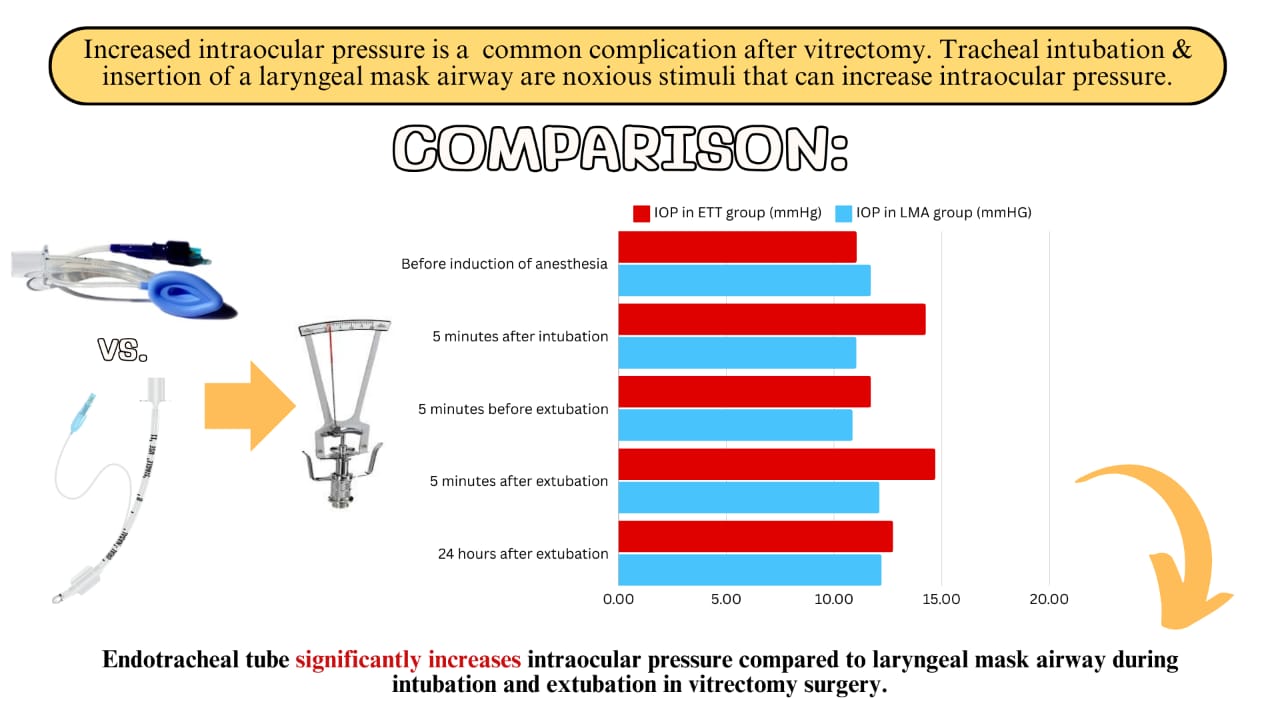 Conclusion: Endotracheal tube (ETT) significantly increases IOP compared to LMA during intubation and extubation in vitrectomy surgery.