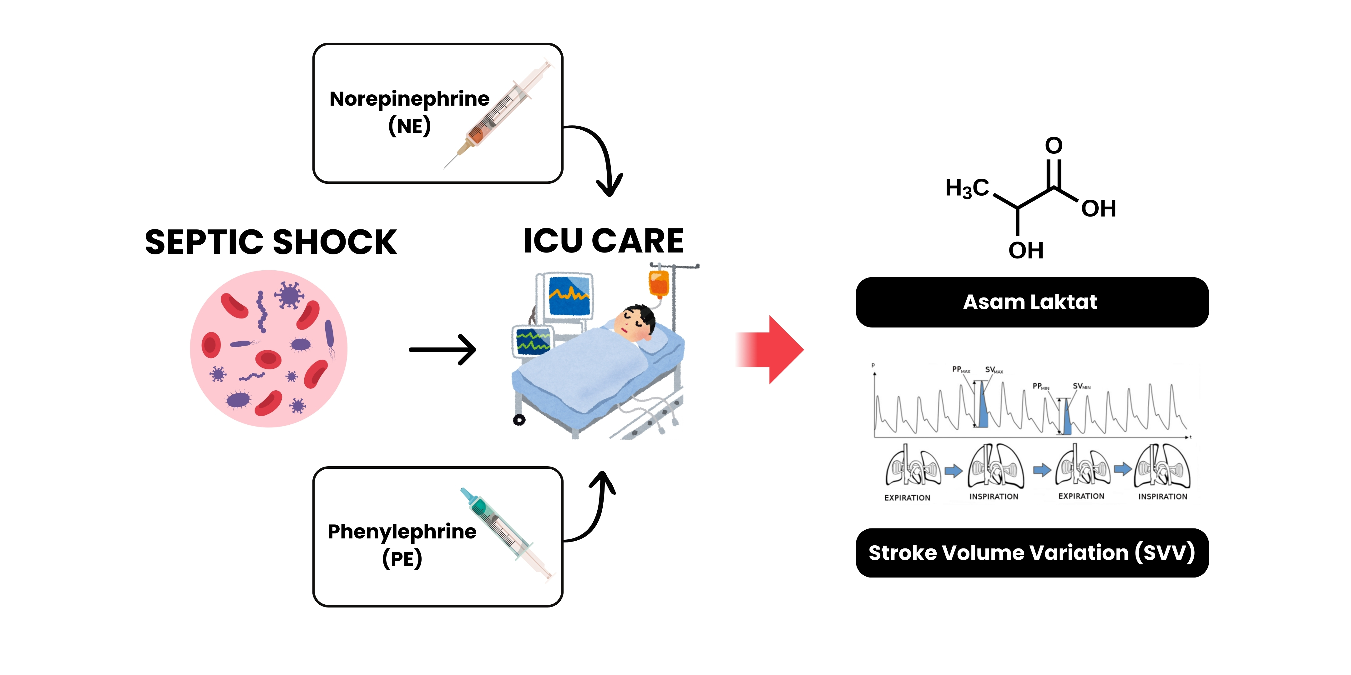 Background: Septic shock is a life-threatening complication of sepsis, characterized by refractory hypotension and tissue hypoperfusion, requiring rapid vasopressor therapy. Norepinephrine is the drug of choice, but phenylephrine is still used in certain conditions, such as tachyarrhythmia or high output. Evidence comparing the effectiveness of the two is still limited, especially in Indonesian ICUs. Therefore, this study assessed the efficacy of norepinephrine and phenylephrine using lactate clearance and stroke volume variation (SVV) as indicators of perfusion and hemodynamic response in the intensive care unit (ICU) of Haji Adam Malik General Hospital, Medan.