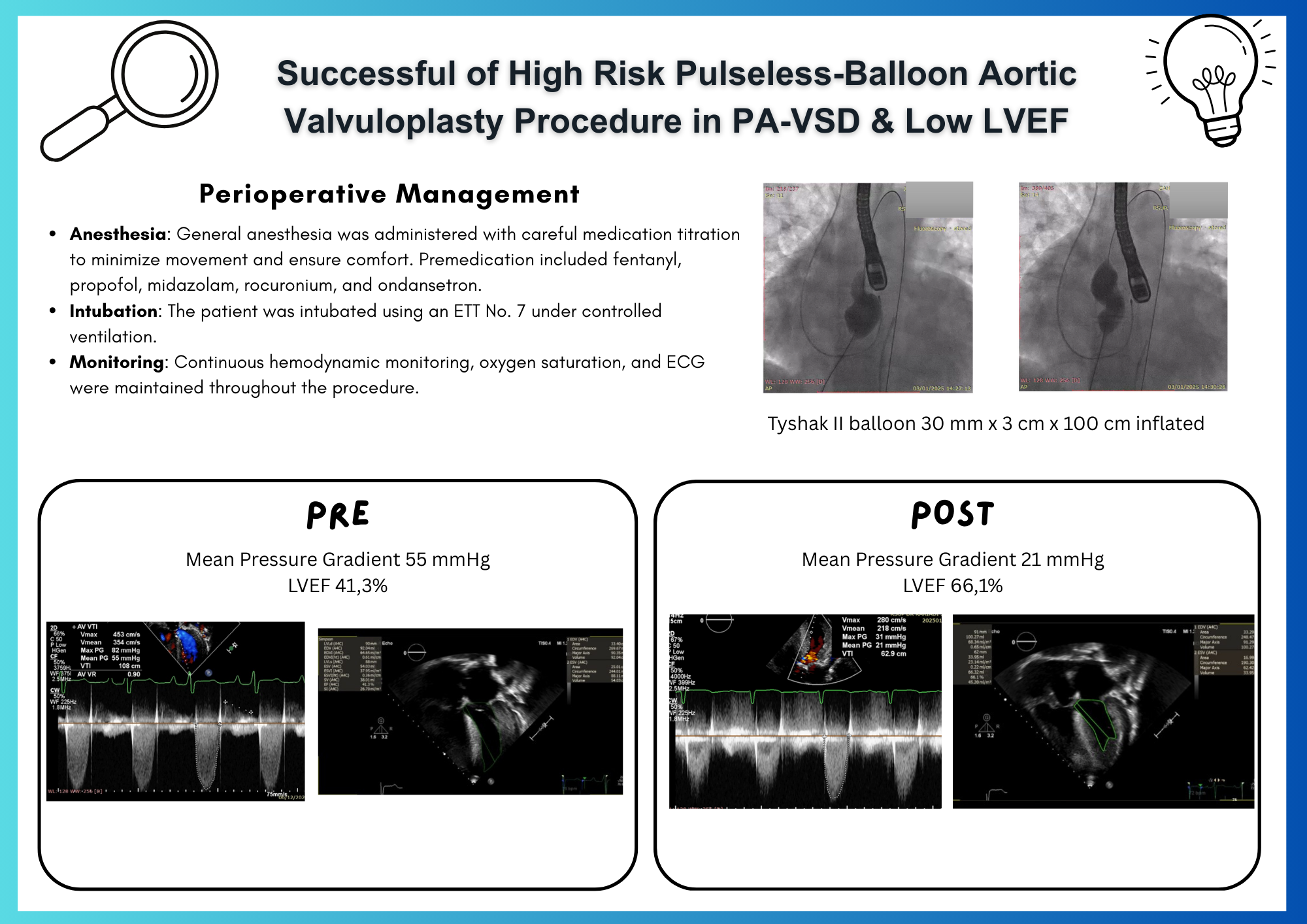 Case: We present a 19-year-old female patient weighing 45 kg with shortness of breath and fatigue. Her oxygen saturation was measured at 90% across all extremities. Electrocardiogram (ECG) findings indicated sinus rhythm with biventricular hypertrophy and incomplete left bundle branch block (LBBB). Chest X-ray revealed cardiomegaly and pulmonary artery dilation, while echocardiography confirmed PA-VSD, severe aortic stenosis with a mean pressure gradient (mPG) of 55 mmHg, and an LVEF of 41.3%. A percutaneous pulseless-BAV was performed using a Tyshak balloon via an antegrade transvenous femoral approach under fluoroscopy and transesophageal echocardiography guidance.