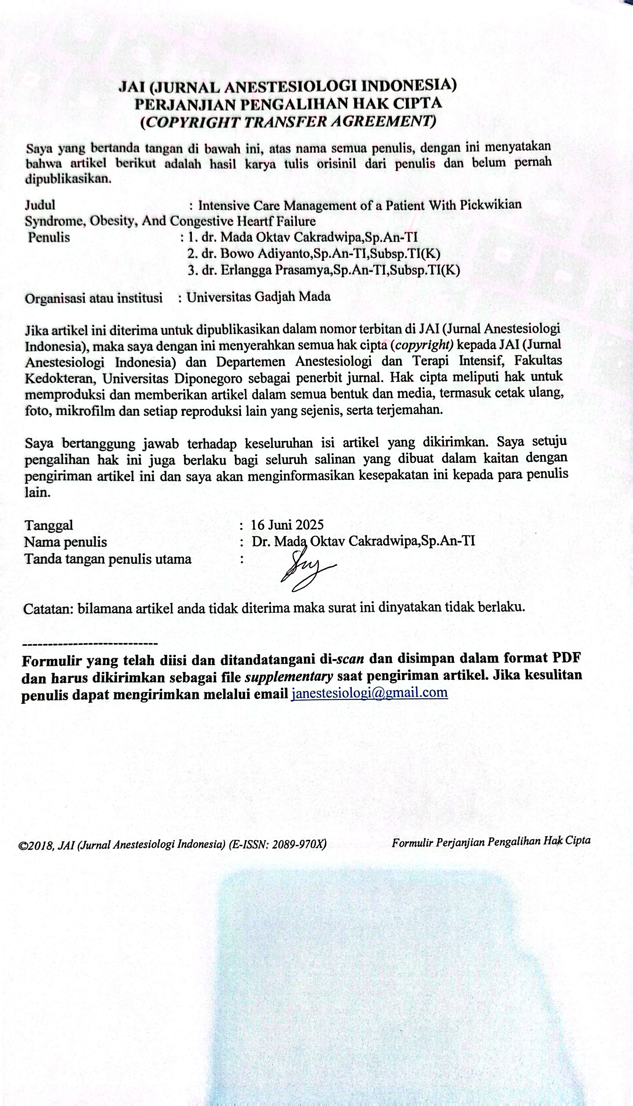 The Authors submitting a manuscript do so on the understanding that if accepted for publication, copyright of the article shall be assigned to JAI (Jurnal Anestesiologi Indonesia) and Department of Anesthesiology and Intensive Therapy, Faculty of Medicine, Diponegoro University as publisher of the journal. Copyright encompasses exclusive rights to reproduce and deliver the article in all form and media, including reprints, photographs, microfilms, and any other similar reproductions, as well as translations.