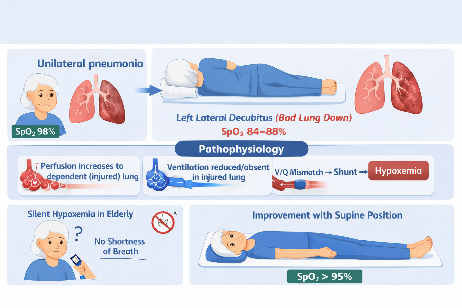 Discussion: In unilateral pneumonia, placing the diseased lung in the dependent position can exacerbate ventilation perfusion mismatch and functional shunt, leading to reversible positional hypoxemia. Older adults may exhibit silent hypoxemia without overt dyspnea, so continuous monitoring during positioning for neuraxial anesthesia is crucial. In this case, the reproducible pattern of desaturation confined to the LLD position, with rapid improvement in supine and absence of cardiac decompensation or pulmonary edema, strongly supported a positional ventilation perfusion mechanism rather than primary cardiac failure or global ventilatory impairment.