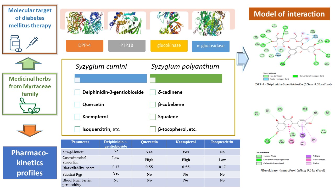 Syzygium polyanthum leaf extract and Syzygium cumini herbs extract have been reported to have antidiabetic activity. This study aimed to predict the molecular target of chemical constituents of S. polyanthum and S. cumini as well as study their interactions with various macromolecular targets of an antidiabetic agent. Molecular docking of all ligands was studied using the Autodock Vina program in PyRx, and the results are presented as binding affinity values (kcal/mol) of ligand against the protein. PyMOL is used to visualize the 3D molecular of docked conformation and ligand-protein interactions. The predicted pharmacokinetic parameters were obtained by SwissADME. Delphinidin-3-gentiobioside and isoquercitrin are predicted to have good interaction with DPP-4 and α-glucosidase, respectively. However, they are predicted to have poor absorption properties. Quercetin and kaempferol are predicted to have good interaction with PTP1B and glucokinase and showed good pharmacokinetic properties.