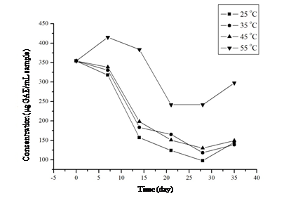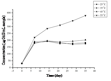Figure 3. Mean Phenolic Content (µg GAE/mL sample) vs. Storage Time at various temperatures (days)