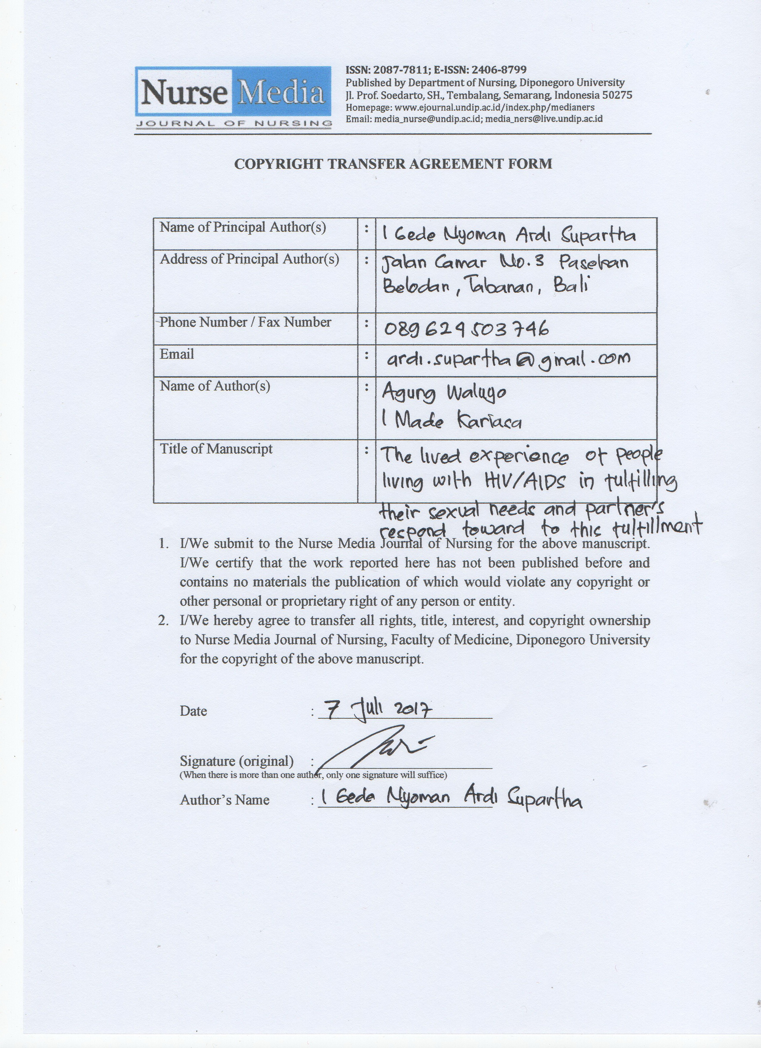 The Authors submitting a manuscript do so on the understanding that if accepted for publication, non-exclusive right for publishing (publishing right) of the article shall be assigned/transferred to Publisher of the Nurse Media Journal of Nursing (Department of Nursing, Faculty of Medicine, Universitas Diponegoro).