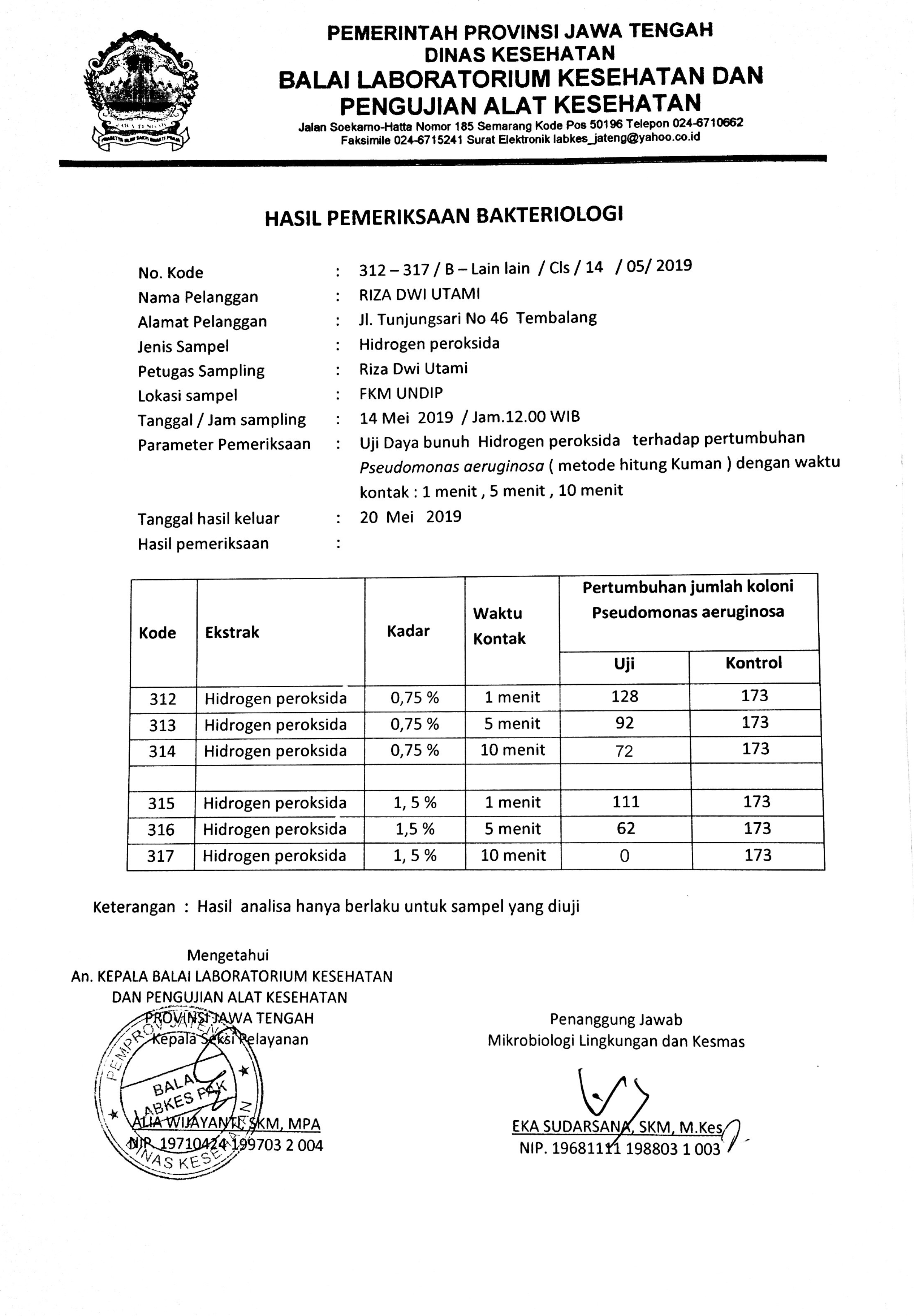 Simpulan:Hidrogen Peroksida dan Formaldehid mampu menurunkan jumlah koloni bakteri Pseudomonas aeruginosapada limbah jarum suntik meskipun belum semuanya hilang.