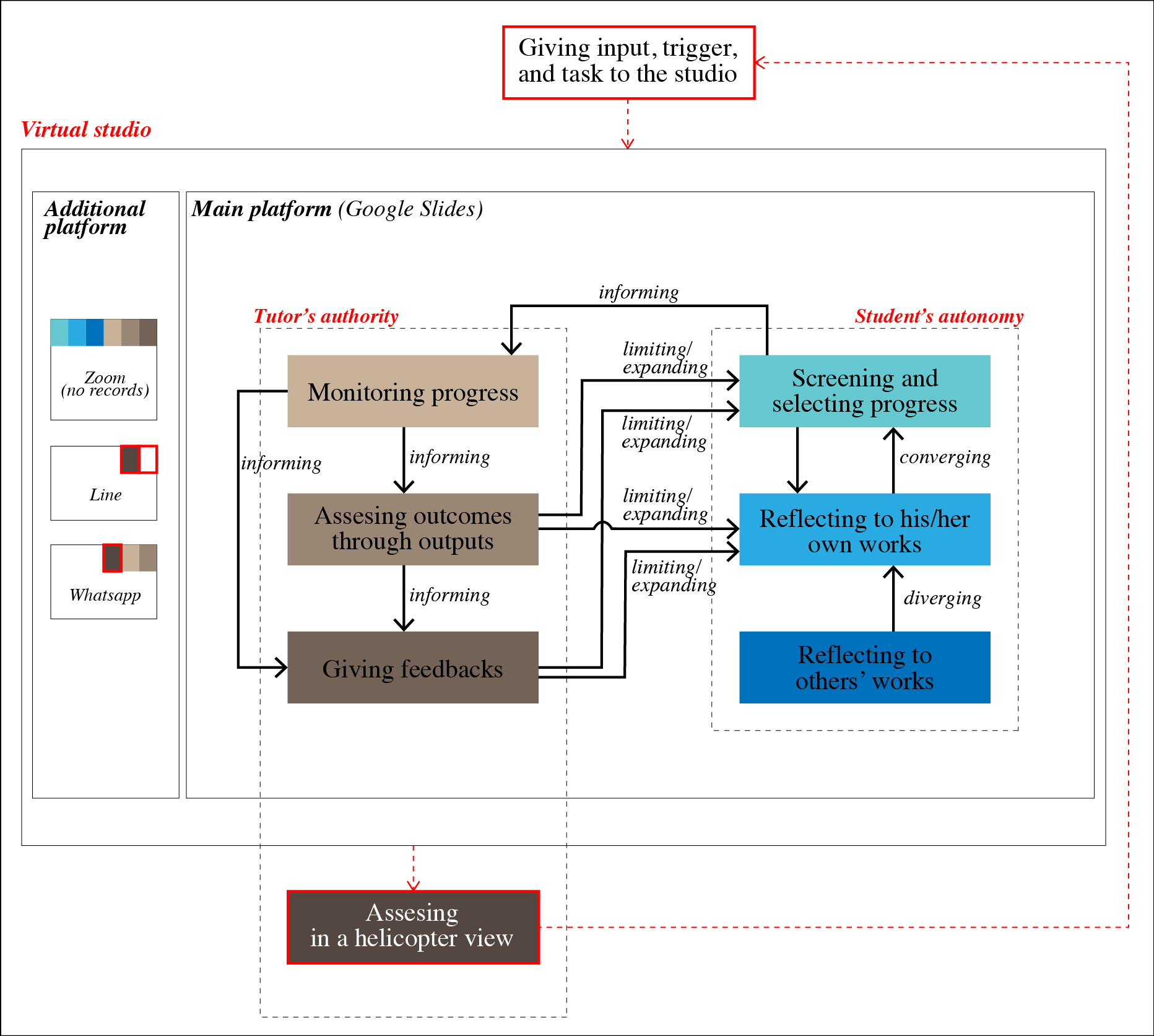 This paper highlights a strategy for design studio learning due to the restriction during the COVID-19 pandemic that requires an immediate change from physical, face-to-face learning to virtual, online learning. The study examines how creative design and knowledge construction could be monitored throughout the learning process in the virtual studio. The study reflects upon the autonomy and authority of students and tutors, respectively, as they utilise a particular platform for virtual learning. The virtual communication platform becomes the media to accommodate reflection, peer learning, benchmarking and constructive feedback as essential parts of design learning. The study argues that it is essential to establish a strategy to balance the tutor’s space in maintaining their authority and the students’ space in building their autonomy as a design learner in the virtual studio environment.
