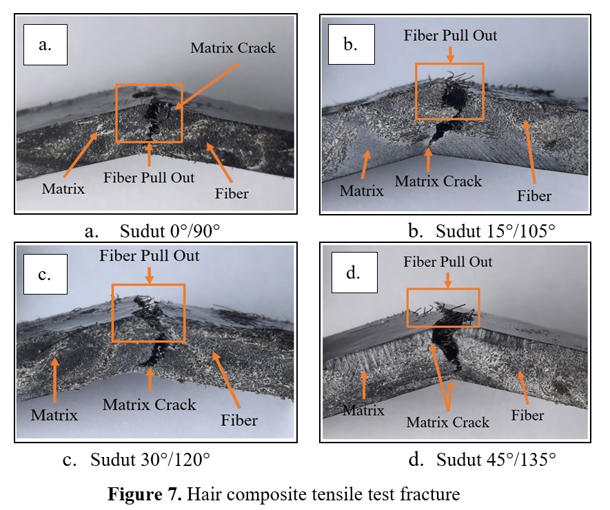 Composite is a combination of two or more materials that have different basic properties. This study aims to analyze the effect of woven angle on hair fiber composites on tensile and bending strength. The composite is composed of polyester resin and human hair waste. Hair was soaked in 5% NaOH solution for 1 hour and woven with angle orientation 0°/90°, 15°/105°, 30°/120° and 45°/135°. The process of making composites is made by the Compression Molding method for 24 hours. After making the composite, a density test was carried out with the ASTM C271 standard, tensile test with ASTM D3039 standard and bending test with the ISO 178 standard. The results of the density test obtained an increase in the density value with the lowest density value of 0.82 g/ml and the highest 0.85 g/ ml to produce a lighter composite. Then the tensile test results show the highest tensile strength value of 16.47 MPa which occurs at an angle of 0°/90°. The results of the bending test obtained an increase in bending strength with the highest bending strength value of 47.1 MPa which occurred at an angle of 0°/90°.